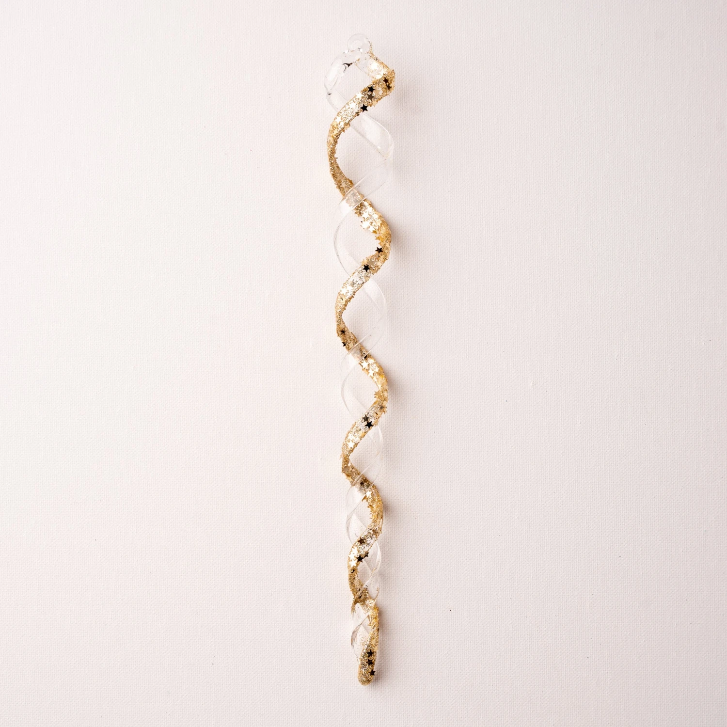 The weather outside is certainly frightful so stay inside, surrounded by a decorated tree and a warm fire. This ornament is clear and gold, coated in glitzy glitter there is a twisted design. Perfect for creating an elegant tree with simple lights could also be placed in your doorways or windows.