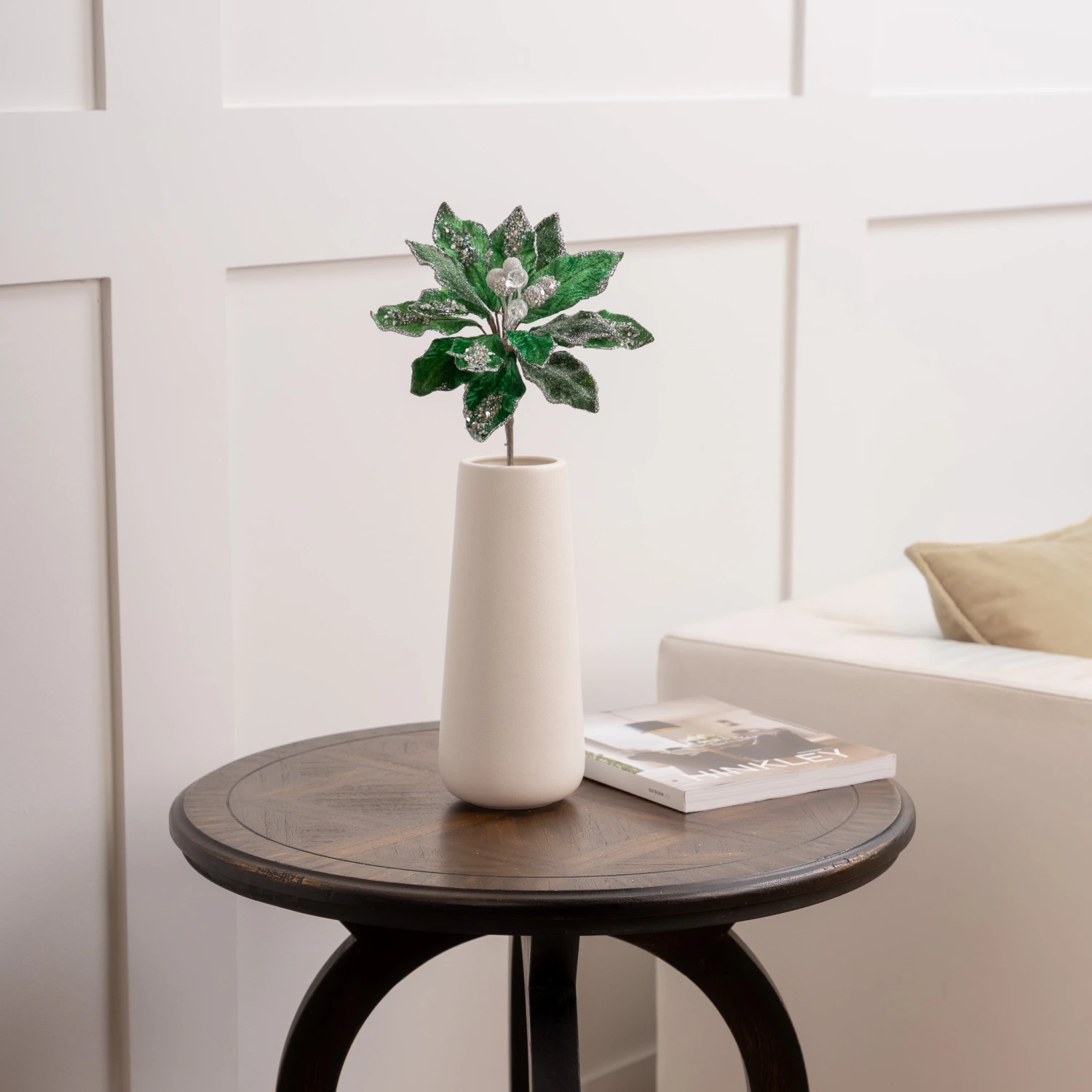 Get the best of natural and elegant charm with this Emerald Poinsettia! With a beaded silver and clear center, this floral has a unique contrast and brings in depth and drama to any Christmas arrangement or tree.