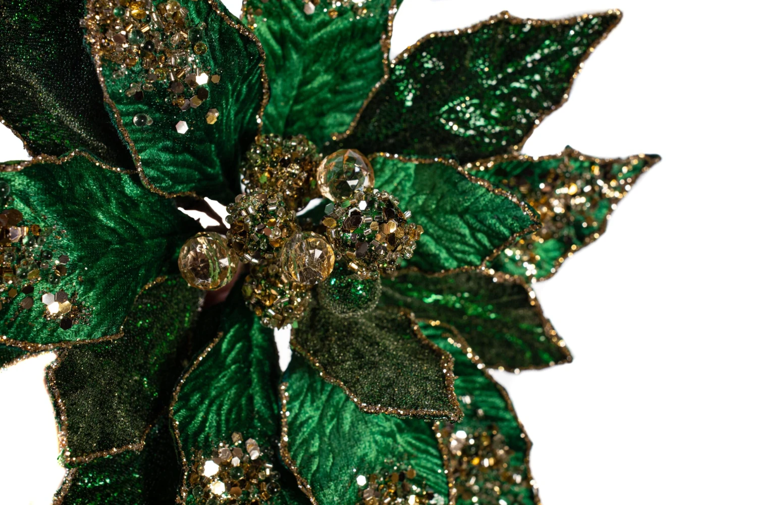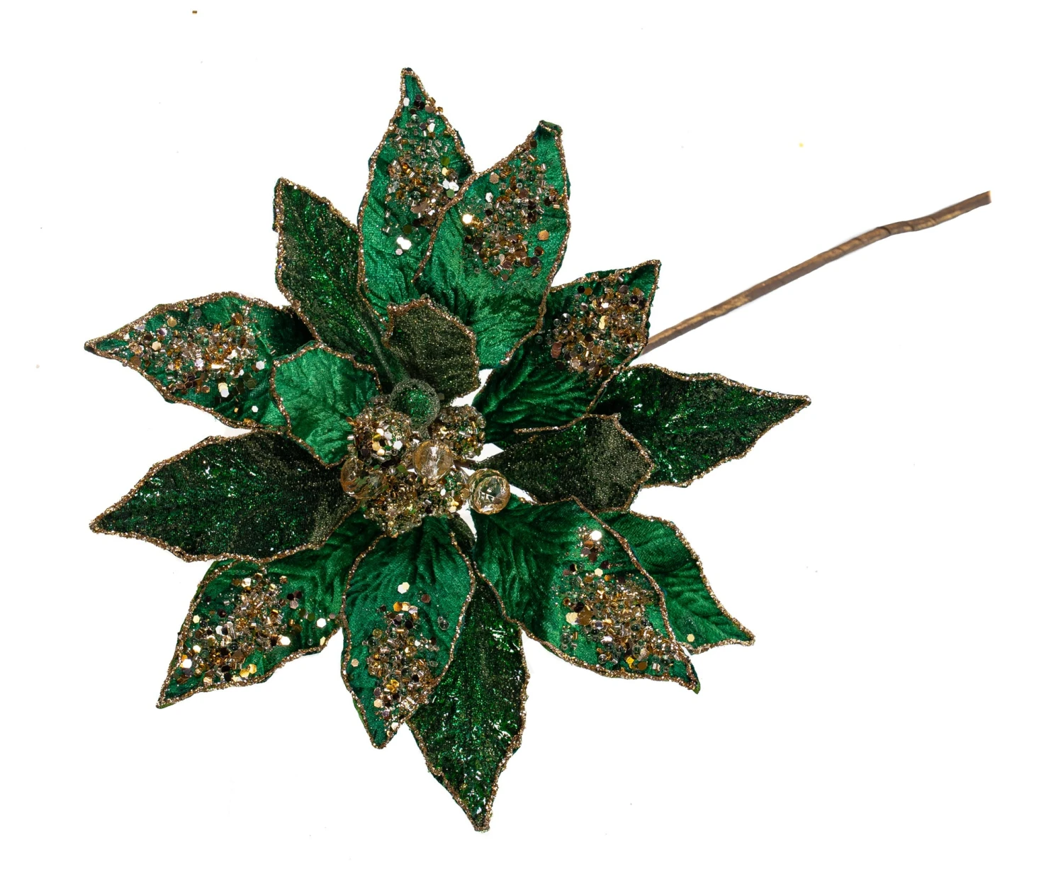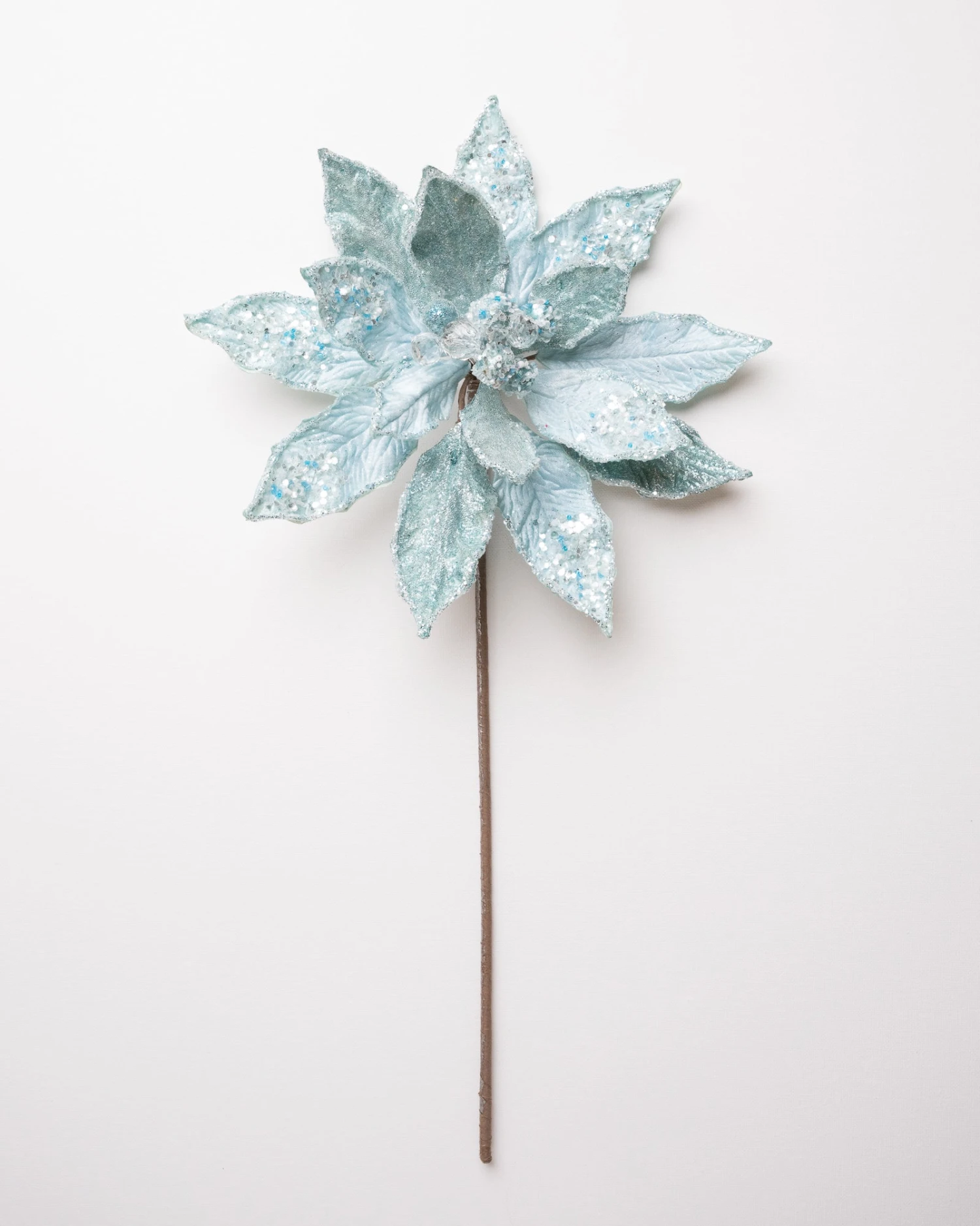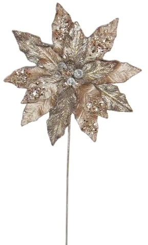 Our flowers feature a beautiful array of unique stems complete with contrasting pieces like this striking icy poinsettia stem. Create a picturesque environment by filling your trees, wreaths, and garlands with this captivating piece.