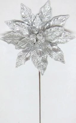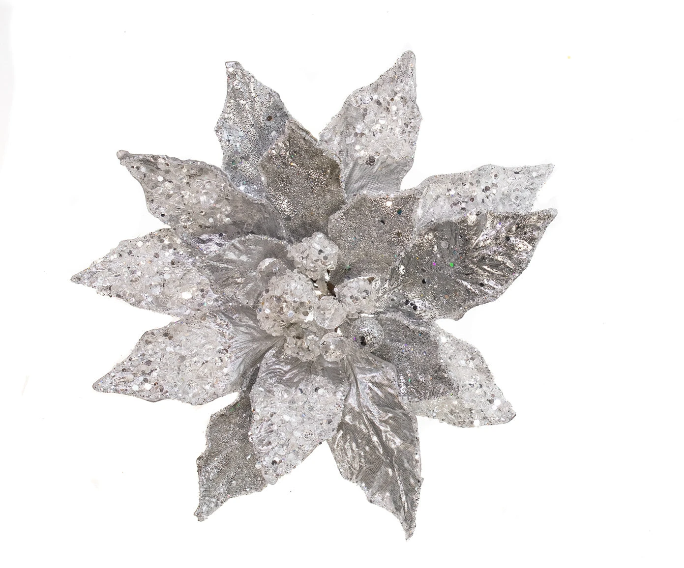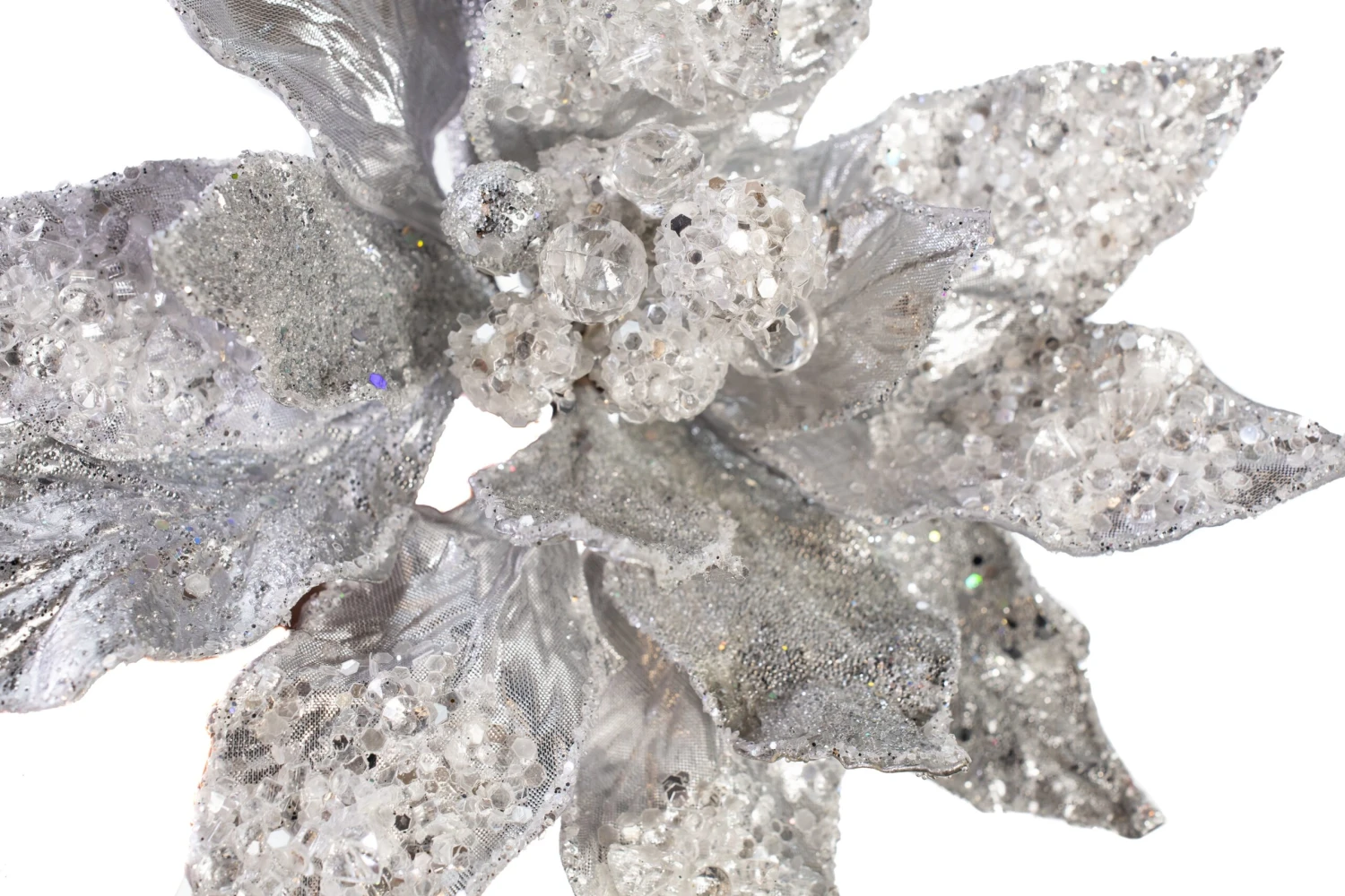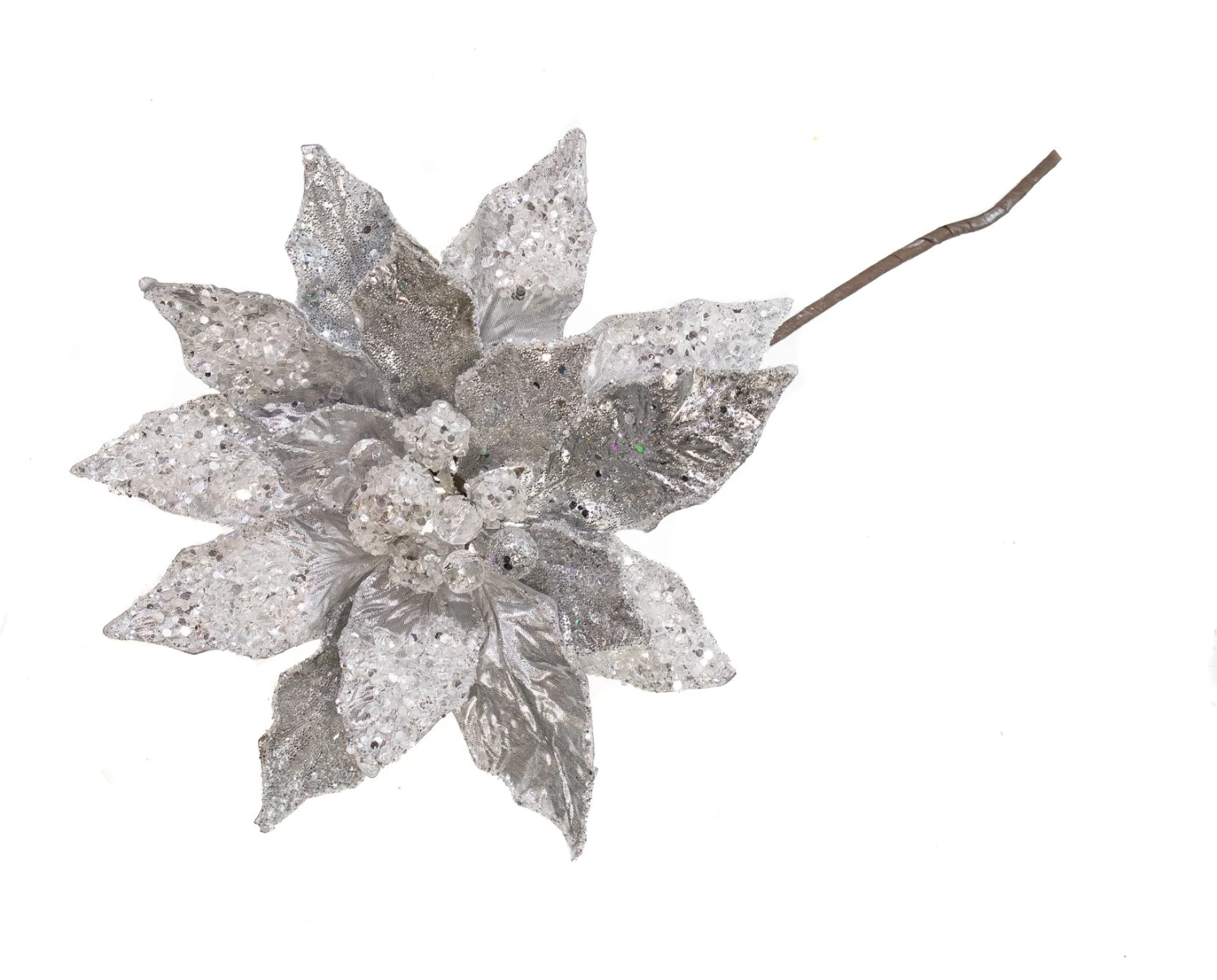 Our flowers feature a beautiful array of unique stems complete with contrasting pieces like this striking icy poinsettia stem. Create a picturesque environment by filling your trees, wreaths, and garlands with this captivating piece.