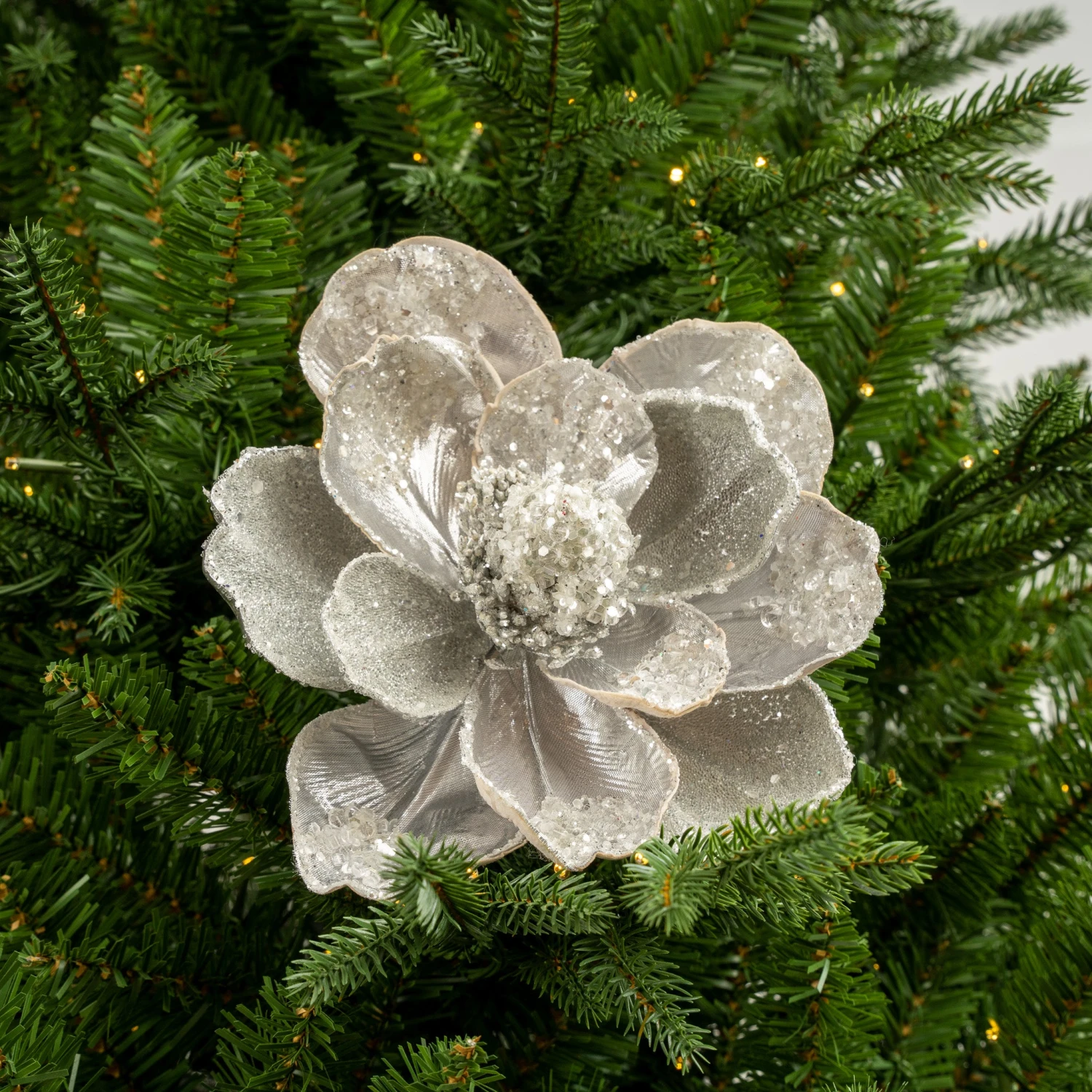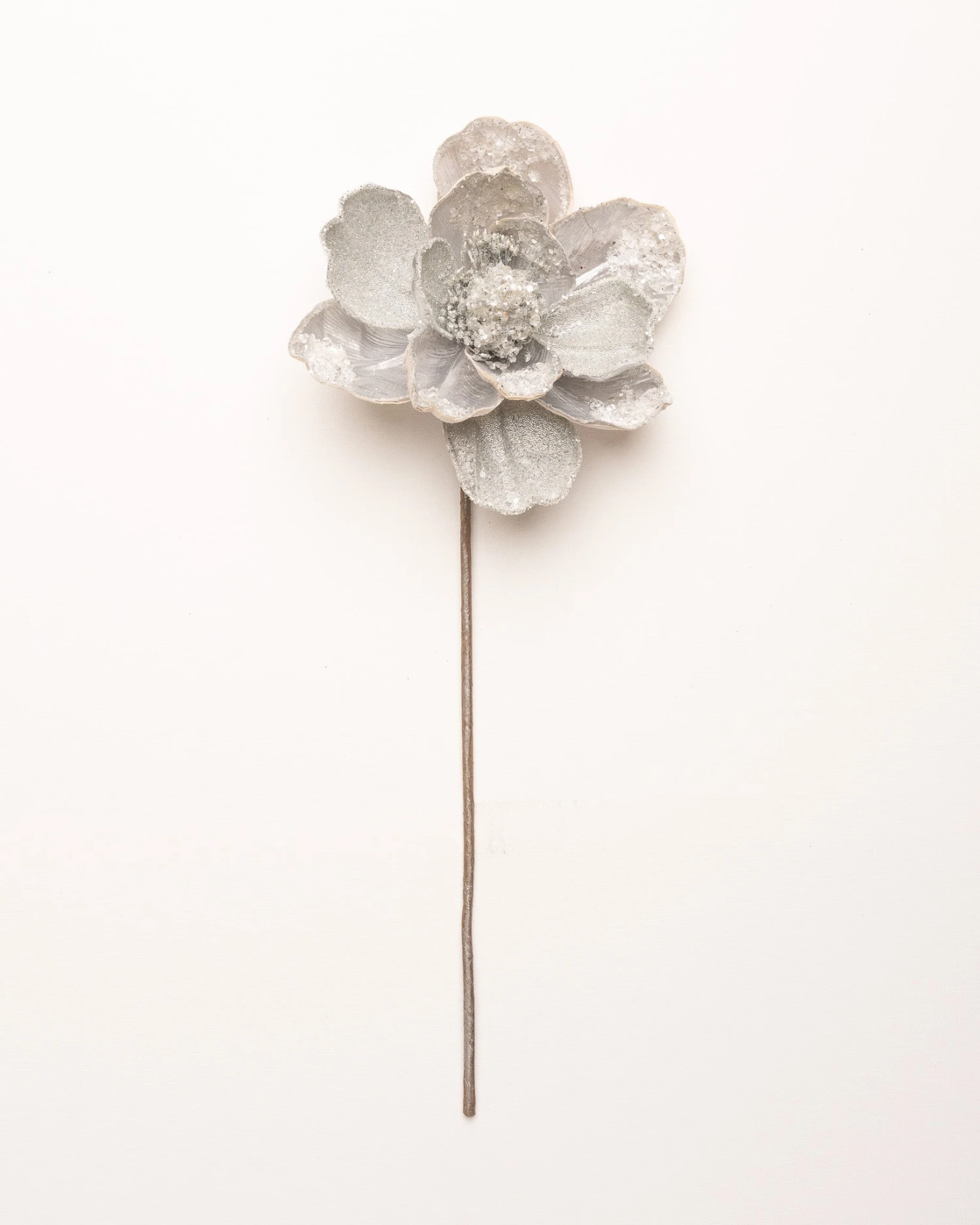 This 18″ Silver & Icy Magnolia set of 6 features bead texture petals for an icy effect and metallic silver accents for added realism. Jeweled stamens complete the luxurious magnolia look perfect for any room. These detailed floral stems are sure to impress.