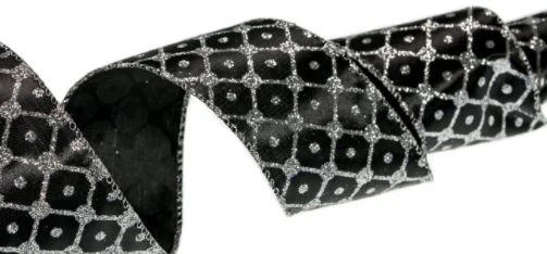 Add this unique yet elegant black and silver ribbon to your holiday decor this season. It features thin silver glittered sqaures with a accent dot in the middle. It measures 2.5″ in width and is also available in 4″ width.
