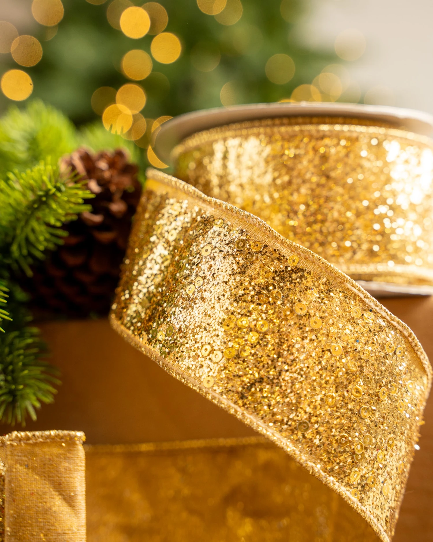 This stunning 2.5″ X 10YD glitter ribbon features a full gold big glitter with gold sequin, complete with a gold back. Perfect for adding a dazzling touch to your Christmas tree or holiday decorations, this ribbon is sure to make a statement!