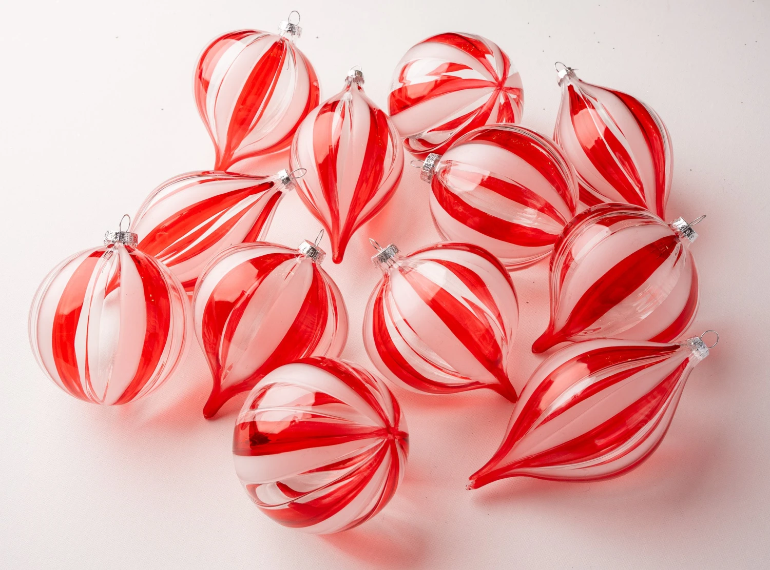 Brighten up your space with these vibrant and unique glass ornaments! Adorned with red stripes and boasting three styles, these 4″ beauties will make a bold statement no matter where you place them.