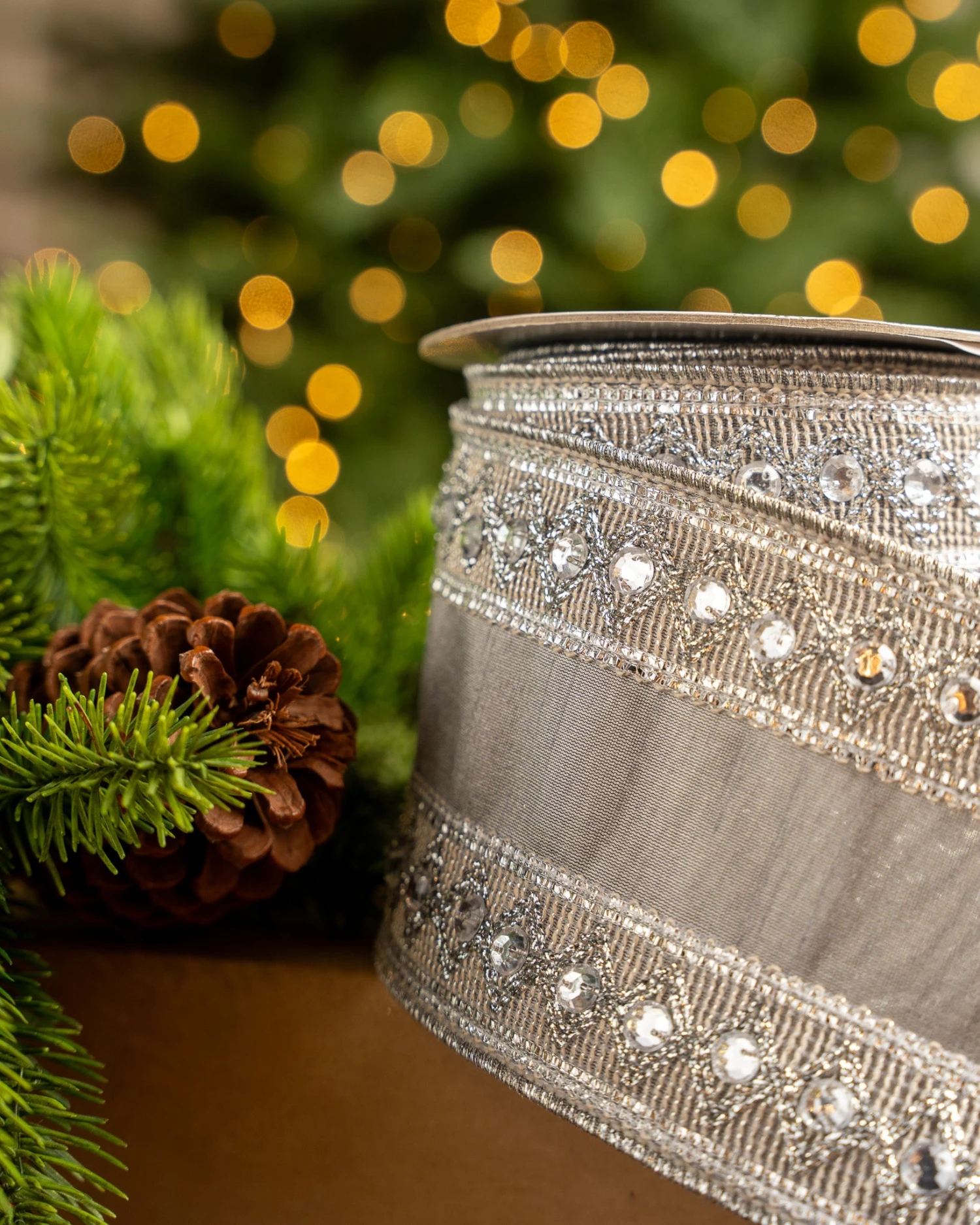 SKU: DGHLY 1695826831 Categories: Ribbons & Bows, Tree Decorations Tags: Collection:The Christmas Palace Collection, Color:Silver, Size:5 Yard, Style:Ribbon, Width:4"
