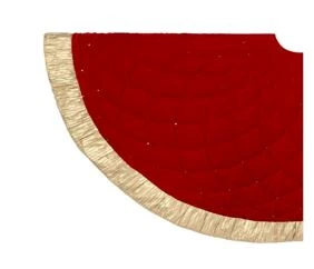 Spread holiday cheer with this 48″ Red & Gold Trim Velvet Tree Skirt! Crafted from lush red velvet and featuring an embossed lattice design and metallic gold pleated trim, this stylish tree skirt will add the perfect touch of holiday festivity to your home. Get the look and feel of a winter wonderland today!