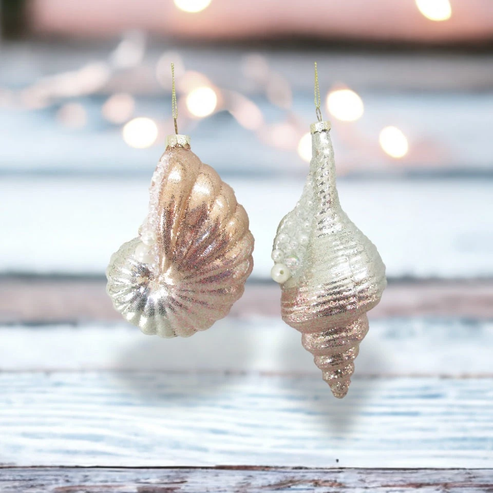 Gorgeous pastel shells bring beach-inspired beauty into your home. Our 6.75″ beaded assorted ornament set of 2 makes a stunning addition to any holiday décor. The taupe and silver sequin shells bring a sparkling serenity to your Christmas tree. Add a touch of seaside adventure to your festive season!